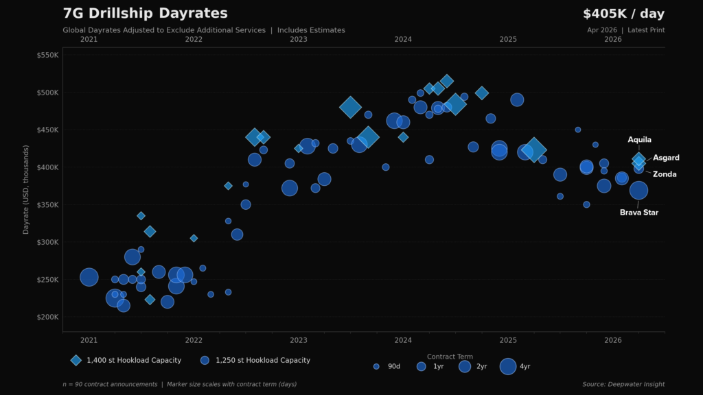 The most telling data points include recent Petrobras awards and Transocean’s Deepwater Asgard. On April 16, 2026, Transocean announced a new contract for Asgard in the East Mediterranean Sea to commence in 4Q26 at a dayrate of $405k. In June 2024, Transocean announced a 365-day contract for Asgard at $515k in the US Gulf, representing the market cycle potentially from peak to trough.