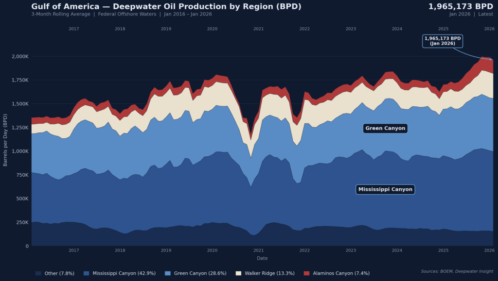 The US Gulf is often characterized as a mature basin, but deepwater production has grown to roughly 2 million bpd as of late 2025, a function of the region’s technological strength rather than resource exhaustion. Transocean’s highest-specification assets, including its 8G drillships capable of 20,000 psi completions, are concentrated here and have been central to that production growth. Chevron’s Anchor and Beacon/Navitas’ Shenandoah are notable examples of technology enabling drilling and completion productivity and well results.