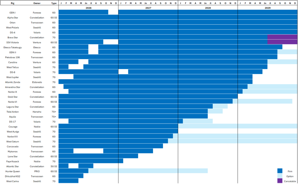 As a part of Petrobras’ Renecon, two 7G drillships had modest dayrate reductions in exchange for existing contract extensions. Eldorado Drilling’s 7G Atlantic Zonda had a 365-day extension (to 2Q29) at a net $397k dayrate when adjusting for the rate reduction across the extended contract period. Transocean’s 7G+ Deepwater Aquila also had a similarly structured 365-day extension through June 2028 at a net dayrate of $411k. Notably, Aquila is an enhanced hookload capacity drillship accounting for a modestly higher dayrate than Zonda.