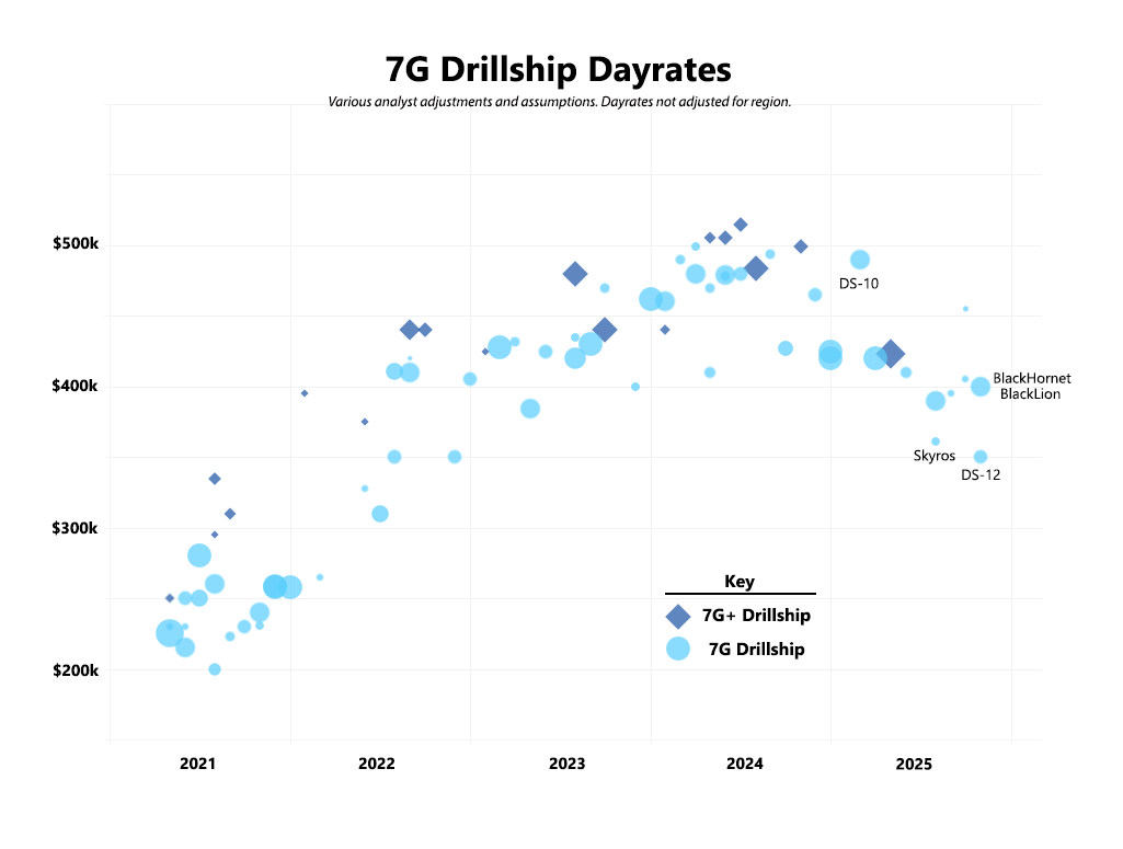 In recent months, 7G drillships have had multiyear contracts announced in the high $300k-to-low $400k range (depending on various adjustments). We have yet to see Transocean announce a 7G+ dayrate in 2025 — is this a sign of prudent price discipline or misjudging the market?