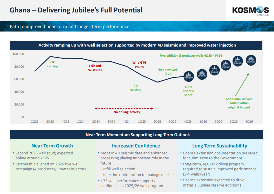 Kosmos: The Jubilee field in Ghana is a source of rig demand that I follow. It has had real challenges with production that I believe are correctable although that is to be determined by the current infill drilling program I previewed here — Tullow & Kosmos: Jubilee’s Mid-Life Crisis. Following Kosmos’ 3Q25 earnings, an update is below: