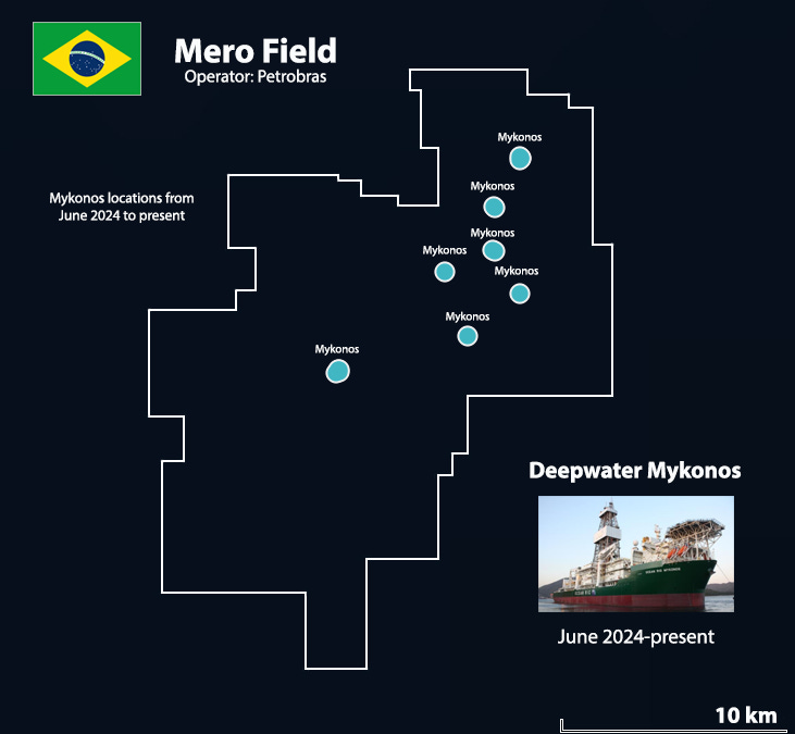 Deepwater Mykonos’ contract with Petrobras is scheduled to conclude in Jan 2026 with a priced option through April 2026. Petrobras currently has at least two tenders outstanding, one for Buzios (likely 3 or 4 rigs) and another for Mero (~1 rig). Mykonos has been working the Mero field in the Santos Basin (~500k bpd production) for at least the last year and a half. While a 6G drillship, Mykonos is MPD-ready and a strong candidate for Petrobras to extend.