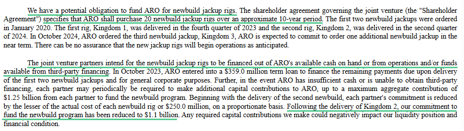 Valaris’ ARO JV faces $1.1B in commitments for newbuild jackups ordered by JV partner Saudi Aramco. These are expected to be funded through the JV’s cash flow or third-party financing, making direct contributions from Valaris unlikely, though the contingent liability remains notable.
