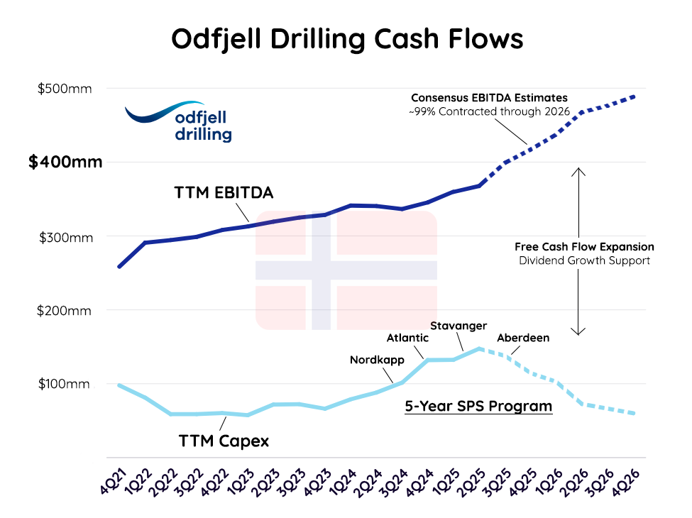 Odfjell Drilling has delivered strong operational and equity performance. Like Transocean today, Odfjell spent 2021–1H23 deleveraging its balance sheet before initiating dividends in 3Q23. Since then, its share price has risen more than 180%. While multiple factors contributed, Odfjell illustrates the bull case for Transocean: once it reaches its leverage target and initiates shareholder returns, equity upside could follow. Transocean has guided to a net leverage goal of ~3.5x, which appears achievable but likely requires another 12–24 months.