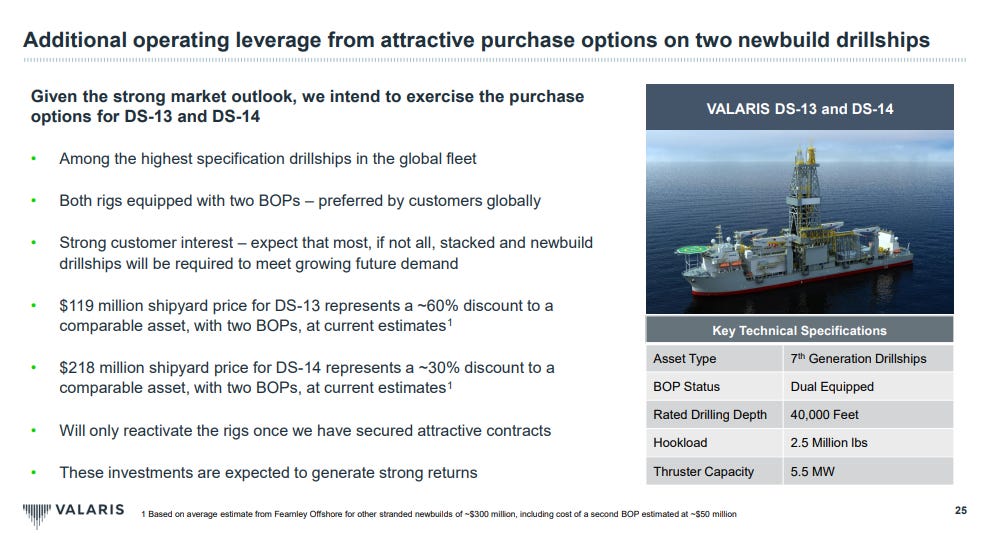 Valaris may have already used much of its discretionary capital with the $337mm purchase of stranded newbuild 7Gs DS-13 and DS-14 in Dec-2023. While attractive buys, both remain uncontracted, cold-stacked in Las Palmas, and each will need ~$100mm of activation capex before working.