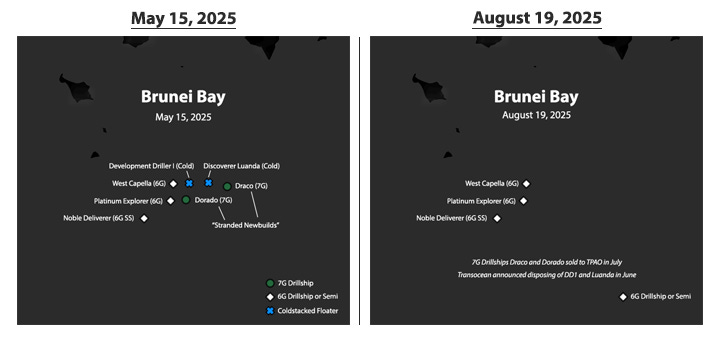 Las Palmas and Brunei Bay have long been storage hubs for idle floating rigs awaiting work or upgrades. Las Palmas still hosts Valaris DS-13 and DS-14, the stranded newbuilds acquired by Valaris. Brunei Bay, however, has seen notable progress: the formerly stranded 7G units Dorado and Draco (originally ordered by Seadrill around 2013) were acquired by Turkey’s NOC, TPAO. Both rigs have now departed Brunei Bay and are expected to relocate permanently to the East Mediterranean and Black Sea regions.