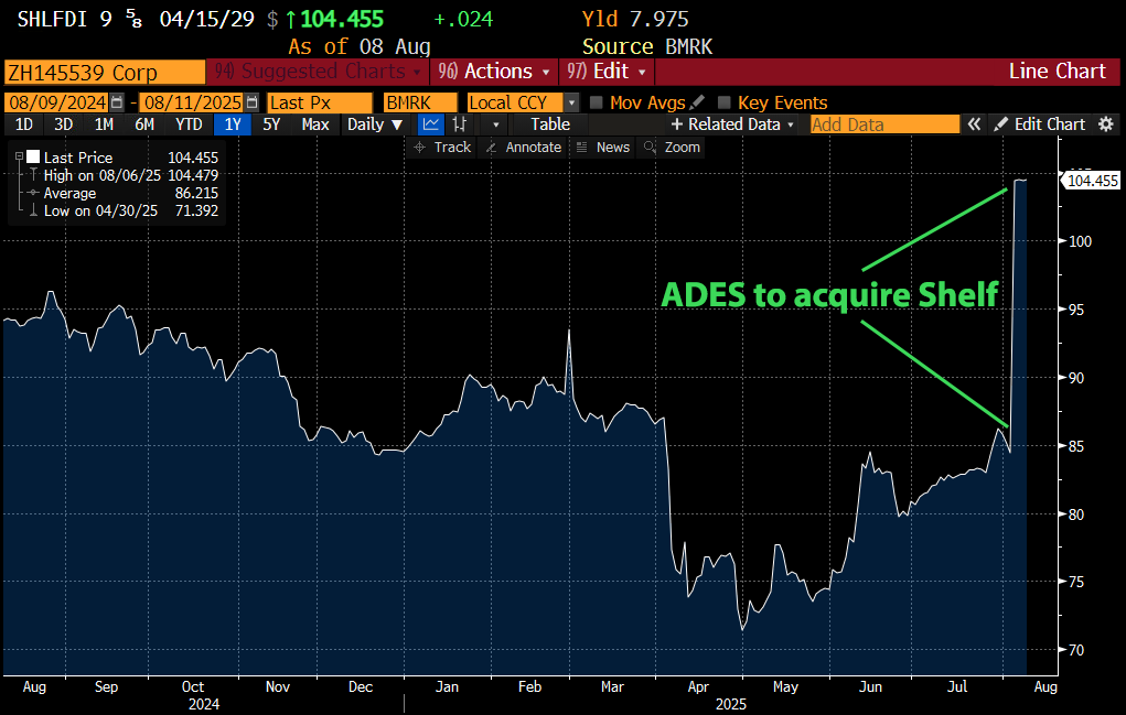 The 1L BORRNO 2028s rallied ~3 points on ADES’ acquisition of Shelf, tightening spreads by roughly 140 bps. Now quoted near 99.5, the bonds offer less pull-to-par from the heavy amortization schedule but still carry a 10% coupon.